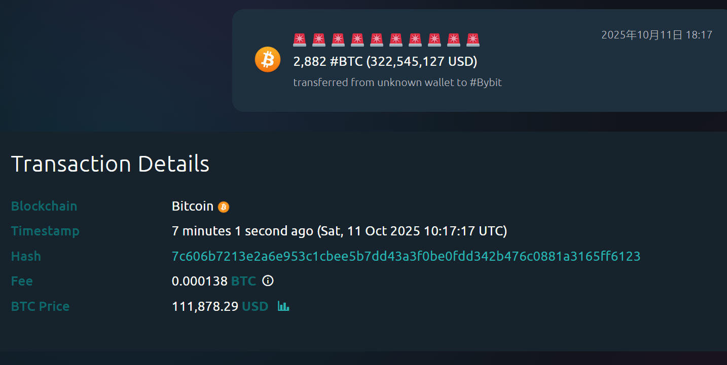 某未知钱包约 7 分钟前向 Bybit 转入 2,882 枚比特币,价值约 3.23 亿美元