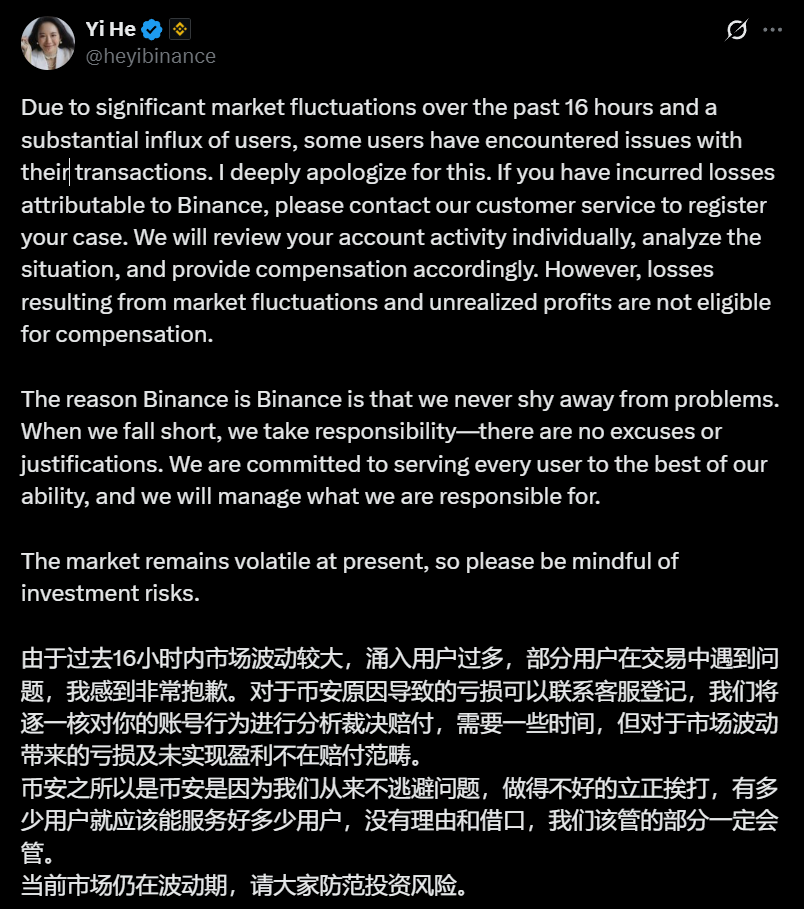 深潮 TechFlow 消息,10 月 11 日,何一在社交媒体发文表示,“由于过去16小时内市场波动较大,涌入用户过多,部分用户在交易中遇到问题,我感到非常抱歉。对于币安原因导致的亏损可以联系客服登记,我们将逐一核对你的账号行为进行分析裁决赔付,需要一些时间,但对于市场波动带来的亏损及未实现盈利不在赔付范畴。