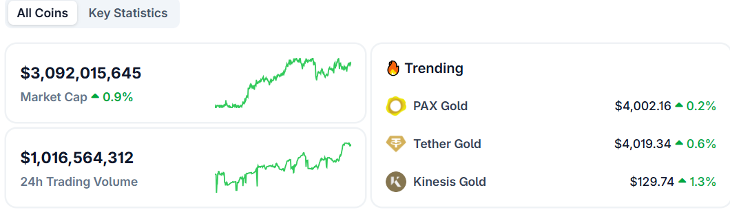 代币化黄金板块在市场动荡期间保持稳定,市值触30.9亿美元高点