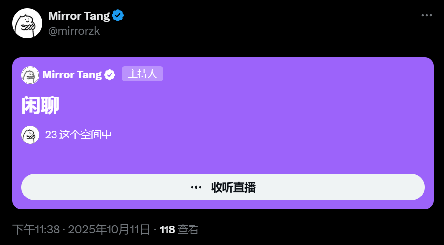深潮 TechFlow 消息,10 月 11 日,ZeroBase 创始人 Mirror Tang 在 X 上开启 Space。