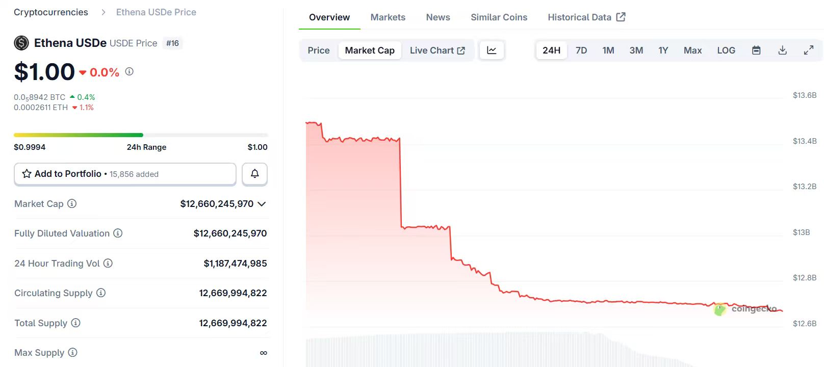 深潮 TechFlow 消息,10 月 12 日,据Coingecko行情显示,由Ethena Labs发行的稳定币USDe市值已从昨日的约135亿美元降至127亿美元下方,现报12,660,245,970美元,较7天前的约148.2亿美元缩水超21.6亿美元。