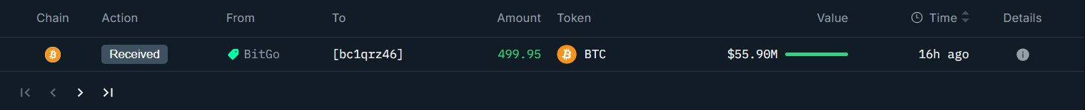 新建钱包“bc1qr”约 16 小时前从 BitGo 接收了 500 枚 BTC,价值约 5590 万美元