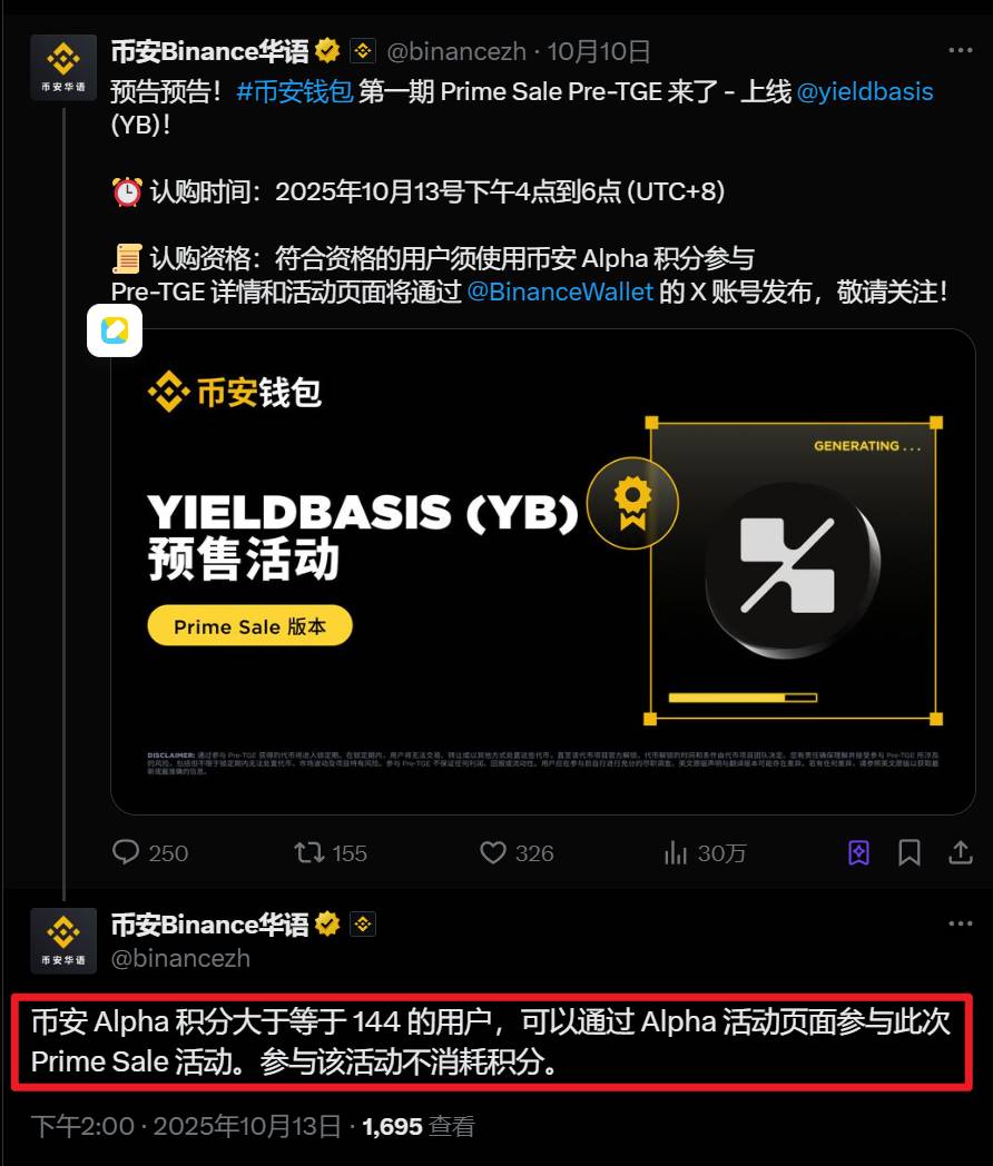 深潮 TechFlow 消息,10 月 13 日,据官方公告,币安 Alpha 积分大于等于 144 的用户,可以通过 Alpha 活动页面参与此次 yieldbasis(YB) Prime Sale 活动。参与该活动不消耗积分。