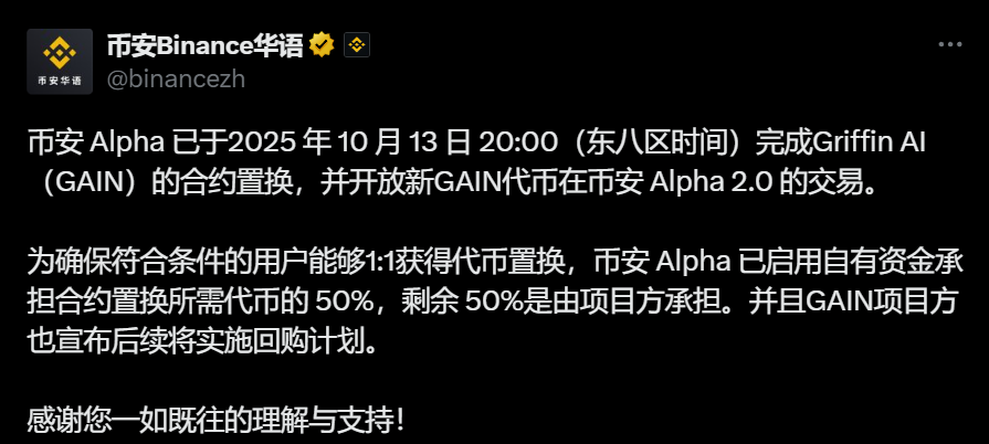币安 Alpha 已于 10 月 13 日 20:00 完成Griffin AI(GAIN)的合约置换