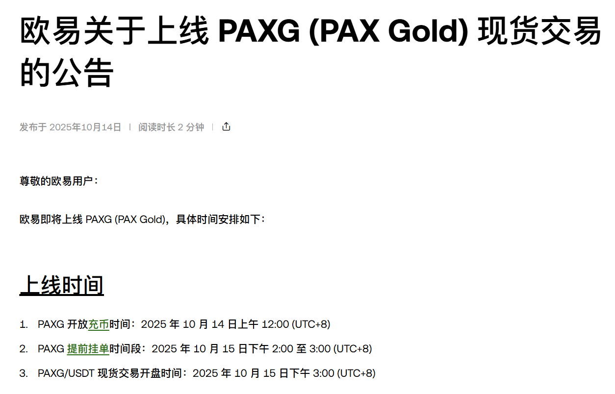 1. PAXG 开放充币时间:2025 年 10 月 14 日上午 12:00 (UTC+8)
