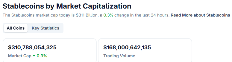 深潮 TechFlow 消息,10 月 14 日,据CoinMarketCap最新数据显示,稳定币总市值已突破3100亿美元,续创历史新高,当前触及310,788,054,325美元,24小时市值涨幅0.3%,其中Tether(USDT)市值1799.69亿美元位列第一,USDC市值758.35亿美元排名第二。