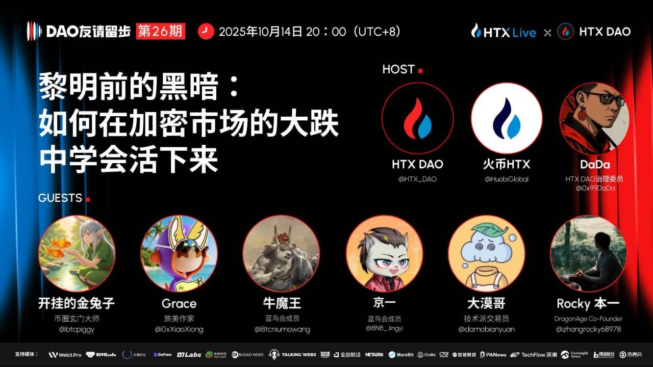 深潮 TechFlow 消息,10 月 14 日,据HTX DAO官方社媒消息,《DAO友请留步》第26期将于今日20时(UTC+8)开播。本期节目以“黎明前的黑暗:如何在加密市场的大跌中学会活下来”为主题,币圈玄门大师开挂的金兔子,旅美作家Grace,蓝鸟会成员牛魔王、京一,技术派交易员大漠哥,DragonAge Co-Founder Rocky本一等加密KOL,将深度探讨加密市场的风险识别与管理,以及如何处理和面对极端行情等话题。