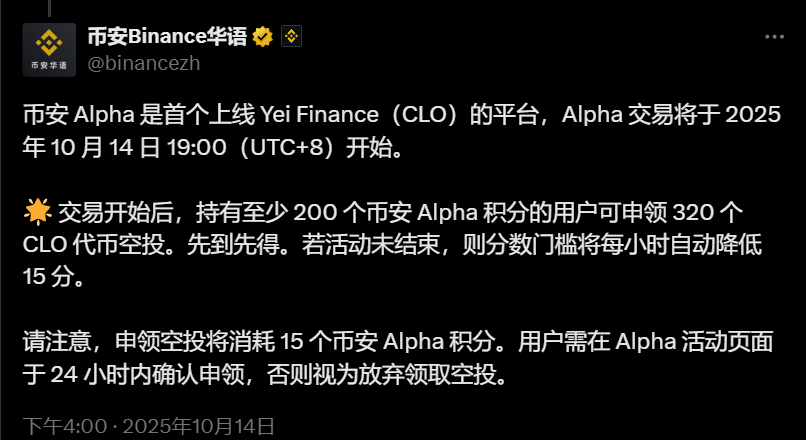 币安 Alpha:Yei Finance(CLO)空投申领门槛为200 Alpha 积分