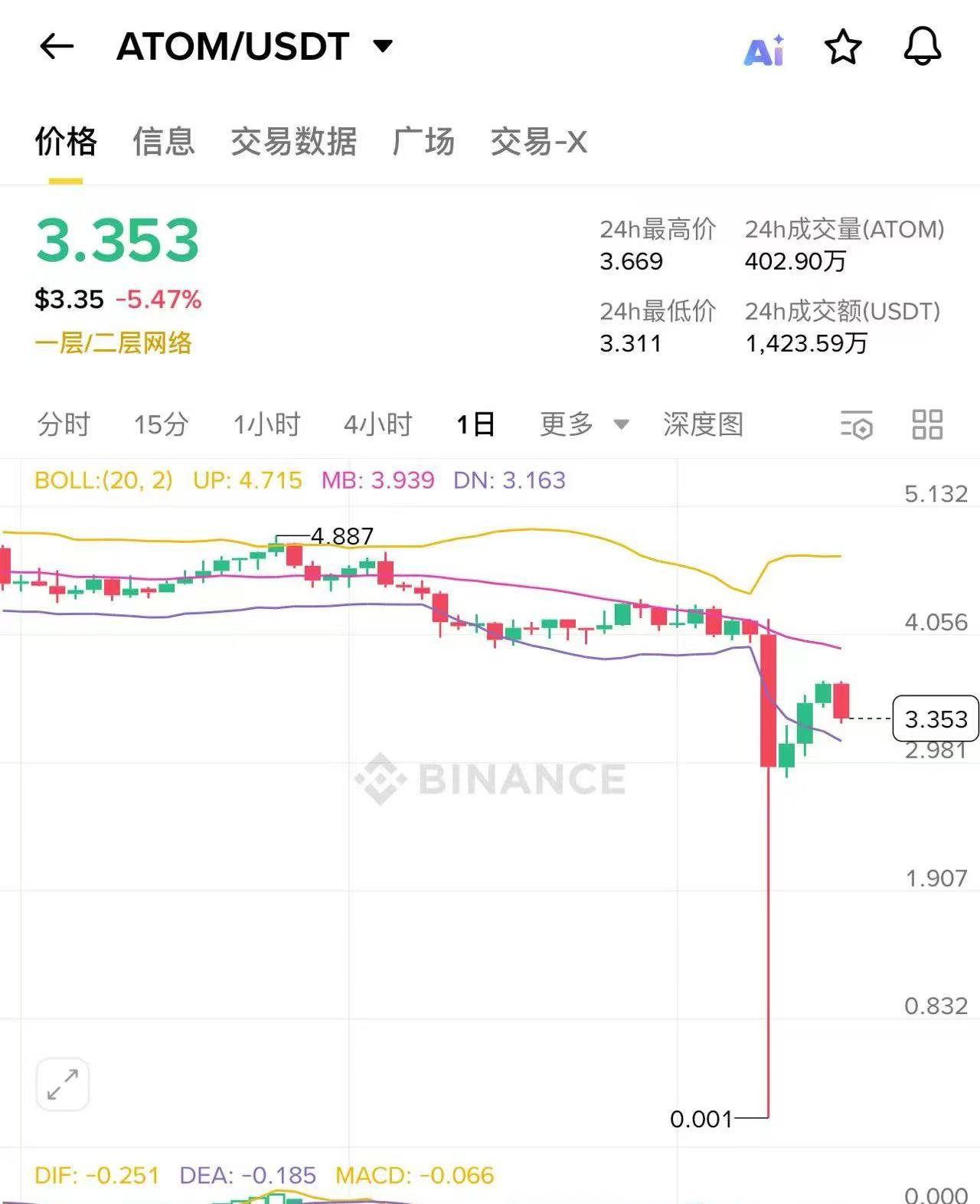 币安将ATOM K线插针低点价格重新改为0.001美元