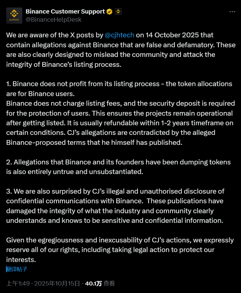 深潮 TechFlow 消息,10 月 15 日,据官方公告,币安发文称,“注意到 2025 年 10 月 14 日由 CJ(@cjhtech)在 X 平台发布的帖子,其中包含针对币安的虚假和诽谤性指控。这些内容显然旨在误导社区,并损害币安上币流程的公正性。