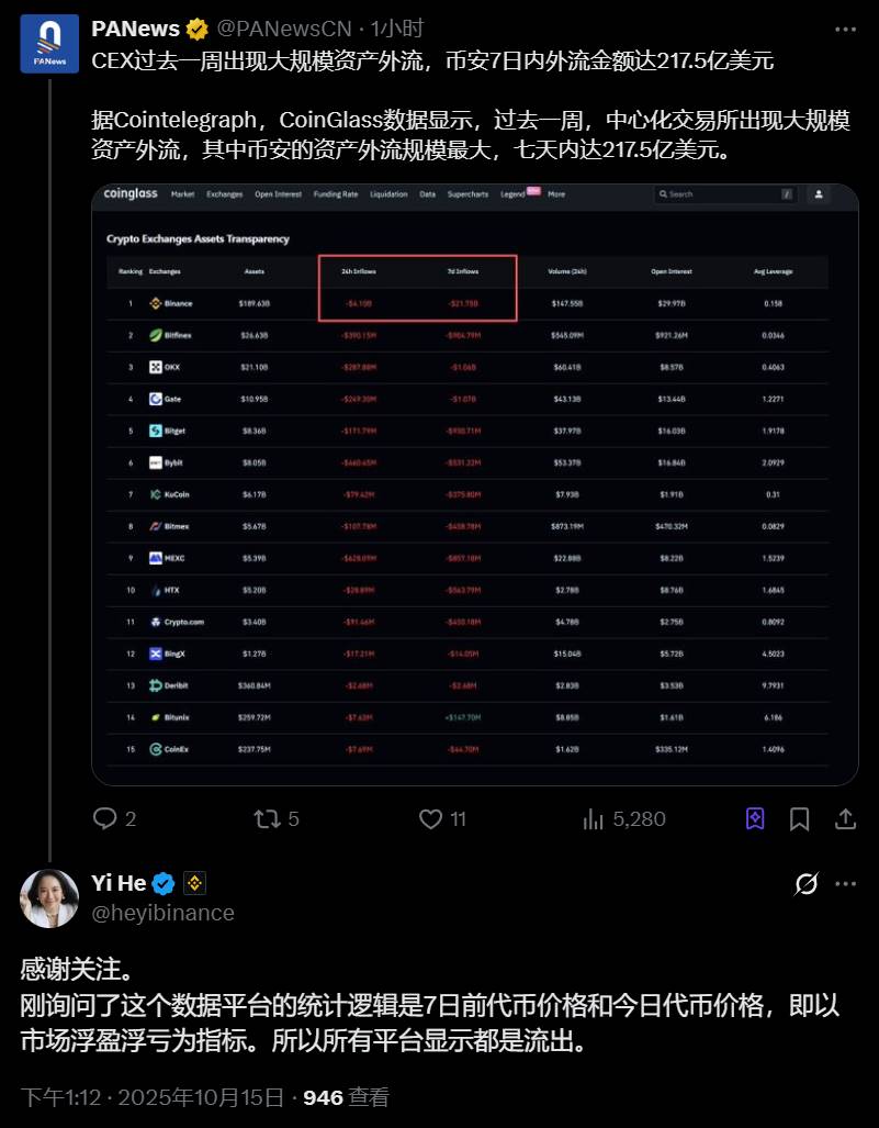 深潮 TechFlow 消息,10 月 15 日,何一在 X 平台回应了关于“中心化交易所出现大规模资产外流,其中币安的资产外流规模最大,七天内达217.5亿美元。”的讨论。