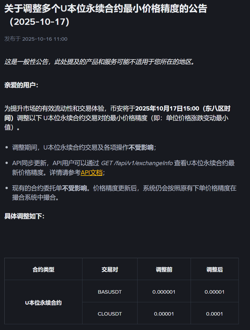 深潮 TechFlow 消息,10 月 16 日,据官方公告,Binance 将于 2025 年 10 月 17 日 15:00(北京时间)调整 BASUSDT 和 CLOUSDTU 本位永续合约的最小价格变动单位。其中 BASUSDT 由 0.000001 调整为 0.00001,CLOUSDT 由 0.00001 调整为 0.0001。