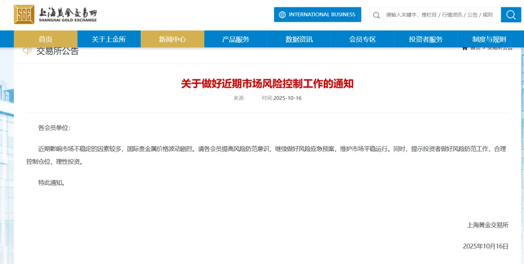 深潮 TechFlow 消息,10 月 16 日,据华尔街见闻报道,随着黄金三日连创历史新高,历史上首次冲破4200美元/盎司,年内涨近60%。面对金价的持续大幅波动,上海黄金交易所今日发布对贵金属市场风险工作控制的通知:
