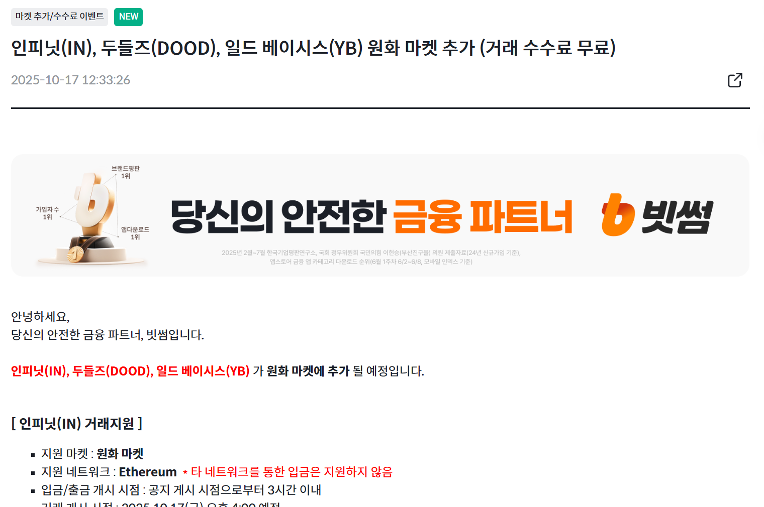 Bithumb 将上线 IN、DOOD、YB 韩元现货交易对