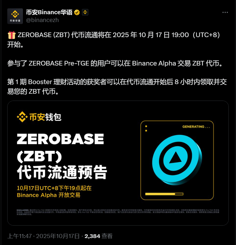 币安钱包:ZEROBASE (ZBT) 代币流通将在 10 月 17 日 19:00 开始