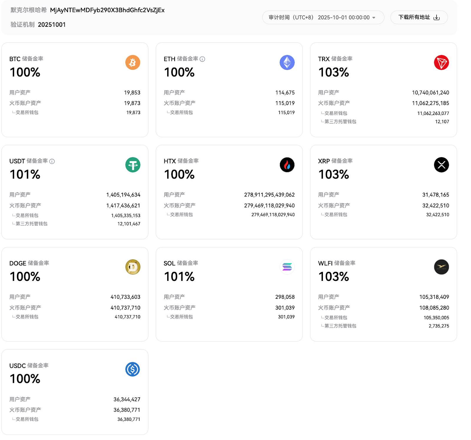 火币HTX更新10月默克尔树储备证明:本月新增USDC、WLFI数据,USDT等10大资产储备充足