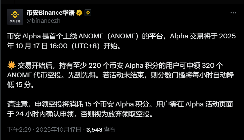 币安 Alpha:ANOME 空投申领门槛为 220 Alpha 积分
