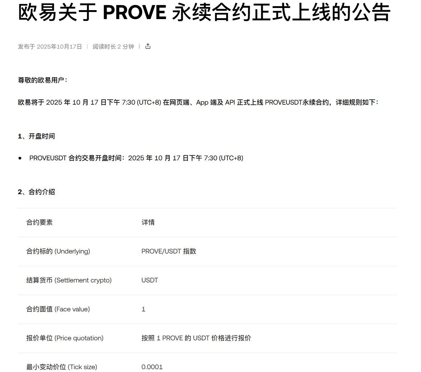 深潮 TechFlow 消息,10 月 17 日,据官方公告,OKX 将于 2025 年 10 月 17 日下午 7:30 (UTC+8) 在网页端、App 端及 API 正式上线 PROVEUSDT永续合约。