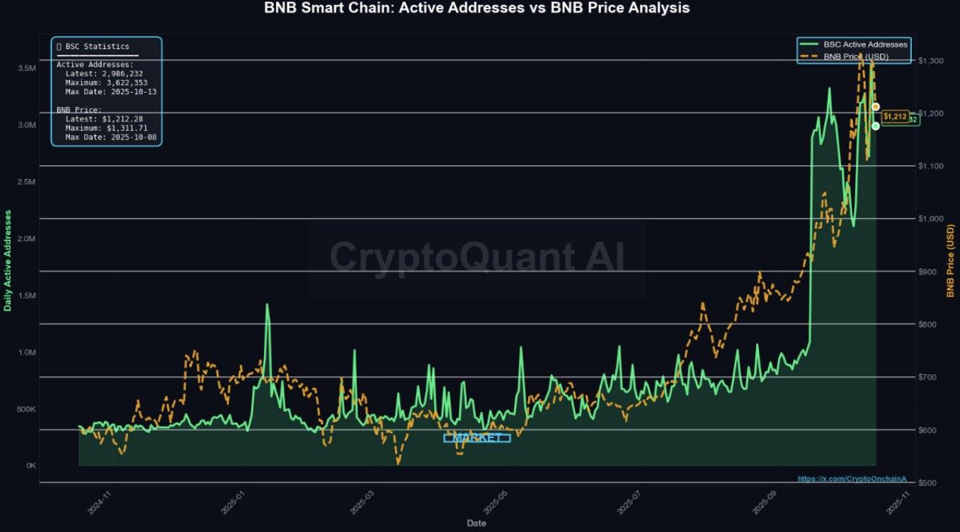 深潮 TechFlow 消息,10 月 17 日,CryptoQuant分析师表示,BNB活跃地址数量达360万,创历史新高,与币价呈现显著相关性。日活地址已成为衡量BSC生态系统健康状况和预测BNB价格走势的关键链上指标。