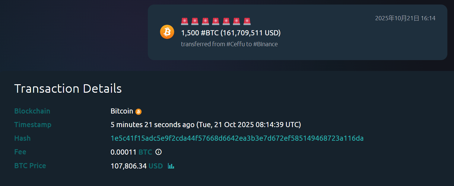 深潮 TechFlow 消息,10 月 21 日,据 Whale Alert 监测, 1,500 枚比特币 6 分钟前从托管平台 Ceffu 转入币安交易所,价值约 161,709,511 美元。