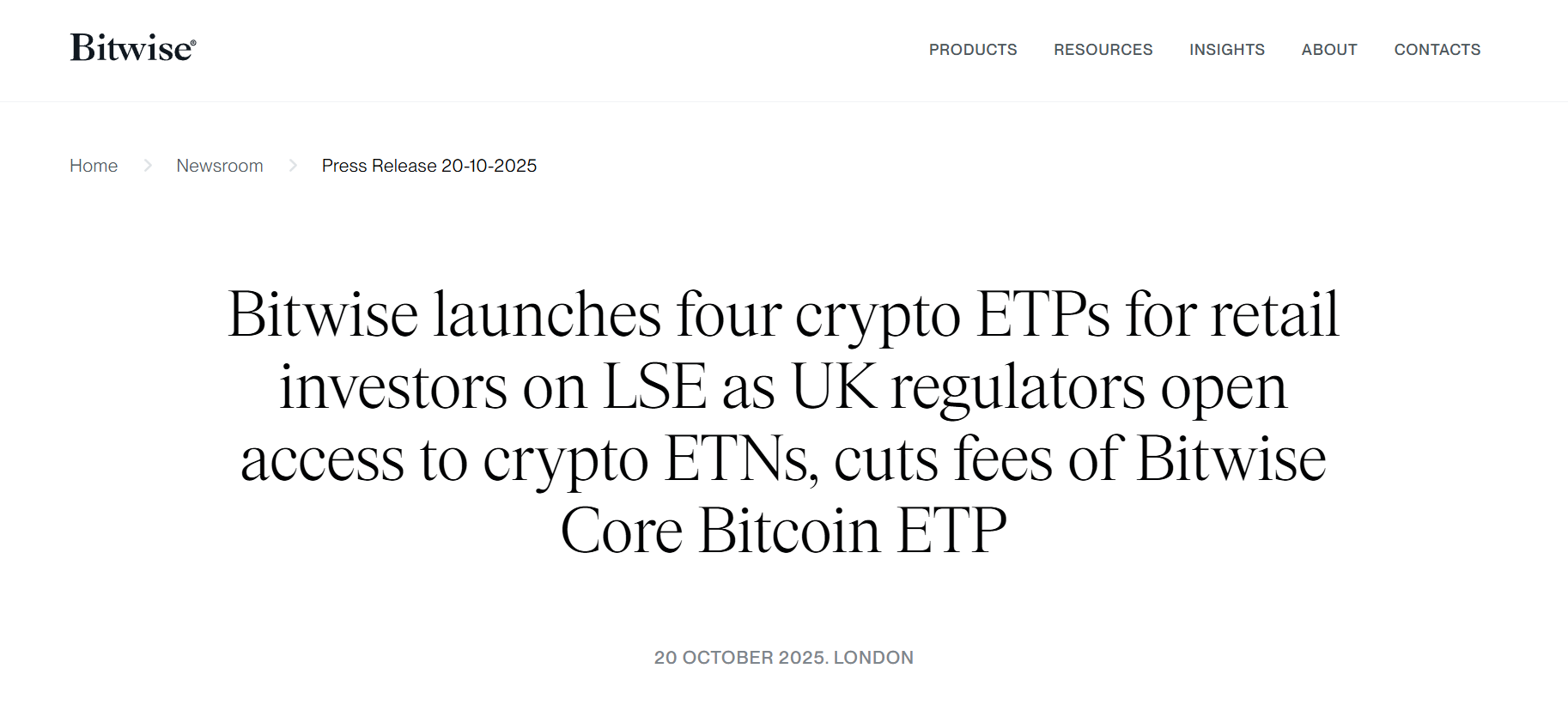 Bitwise 今日在英国推出比特币 ETP