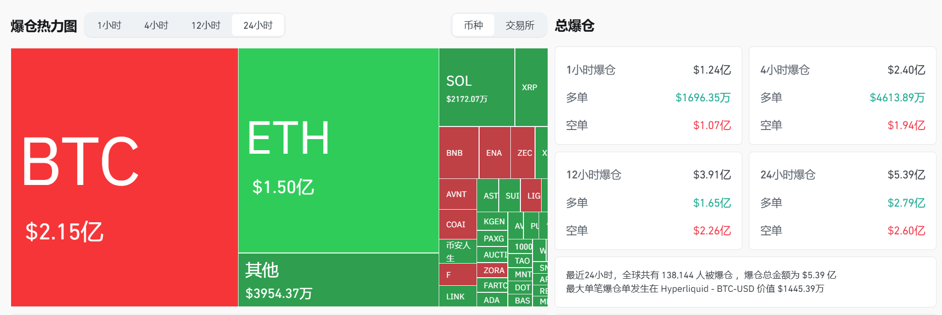 比特币爆仓金额达 2.15 亿美元,以太坊爆仓 1.50 亿美元。过去 24 小时内共有 138,144 人被爆仓,最大单笔爆仓出现在 Hyperliquid 的 BTC-USD 交易对上,价值 1445.39 万美元。