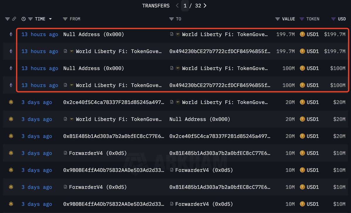 WLFI 于 13 小时前新增铸造 3 亿枚 USD1