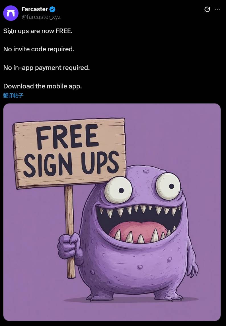 深潮 TechFlow 消息,10 月 26 日,去中心化社交协议 Farcaster 在社交媒体发文表示,其已开放账户免费注册。用户无需使用邀请码,也无需应用内付款。此前,Farcaster 新用户注册曾需支付 5 美元费用。