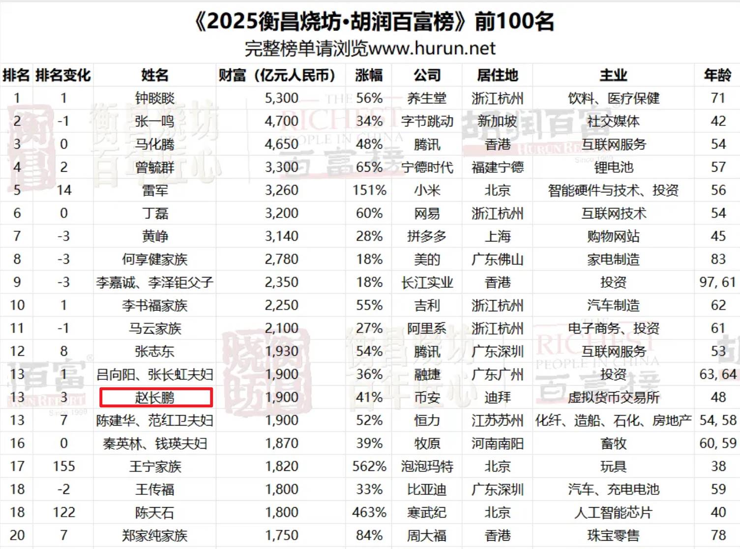CZ 以 1900 亿元财富位居胡润 2025 百富榜第 13 位,财富增长约 41%