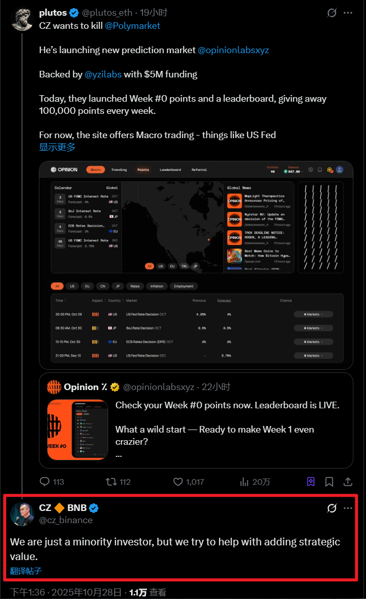深潮 TechFlow 消息,10 月 28 日,CZ 在社交媒体表示,YZi Labs 仅为预测市场 Opinion 少数投资者,但会尽力帮助增加战略价值。
