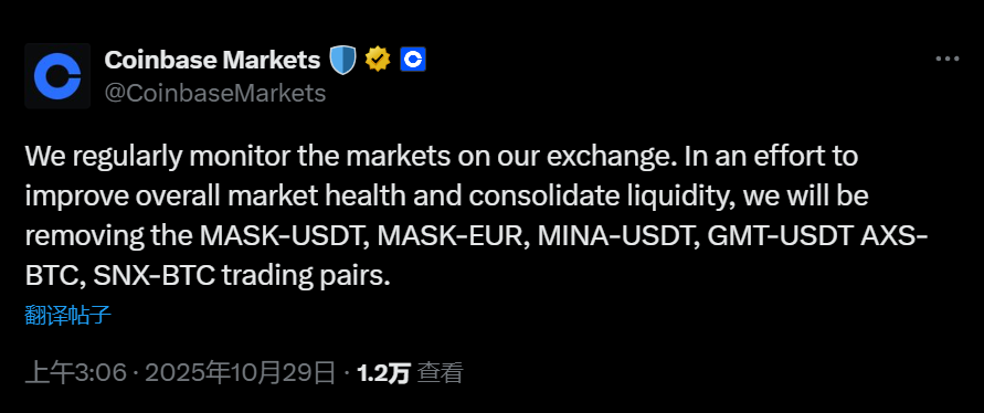 Coinbase 昨日凌晨宣布将下架 MASK-USDT、MINA-USDT、GMT-USDT 等交易对