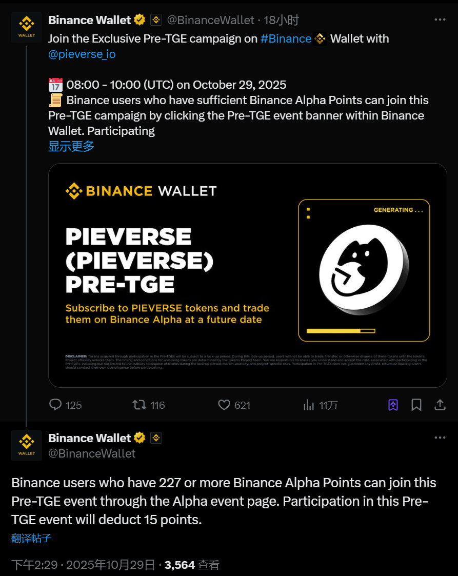 币安钱包:PIEVERSE 独家 Pre-TGE 参与门槛为 227 Alpha 积分