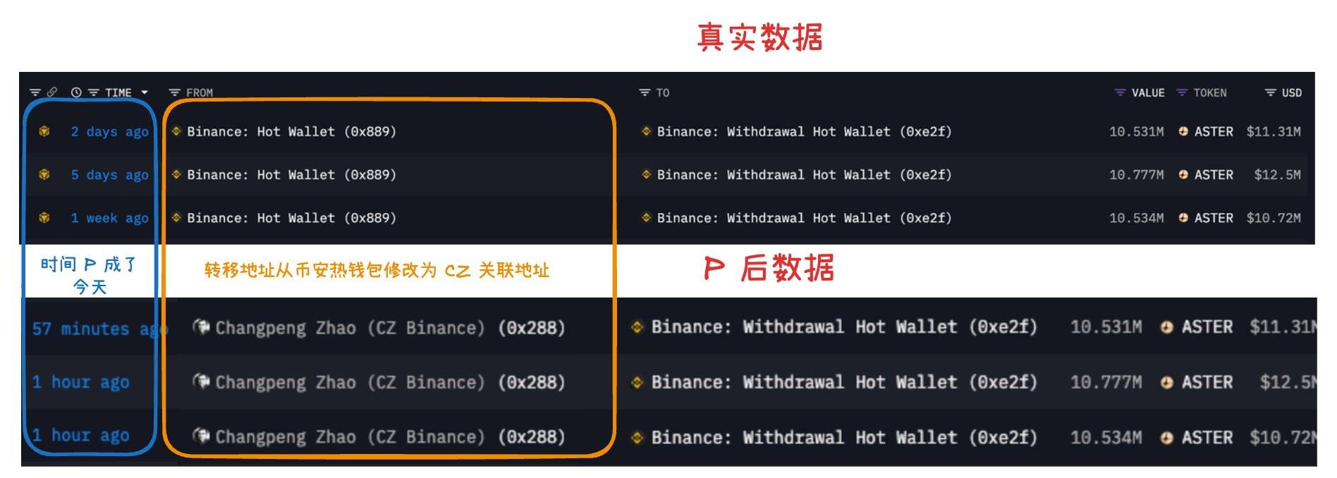 据分析,造假者通过技术手段篡改了两处关键信息:将过去一周币安热钱包之间的流转交易时间伪造为当日早间,并将热钱包地址 0x889...2D4E3 伪造成 CZ 关联地址。