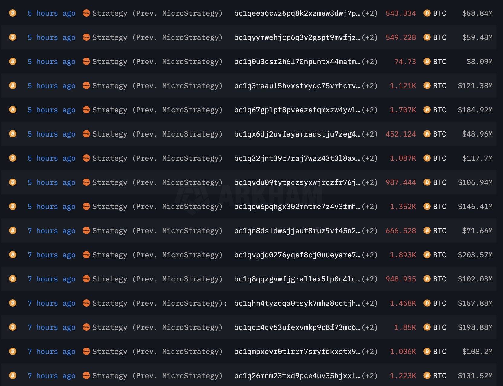 Strategy 9 小时内转移 22,704 枚 BTC 至多个新钱包,价值约 24.5 亿美元