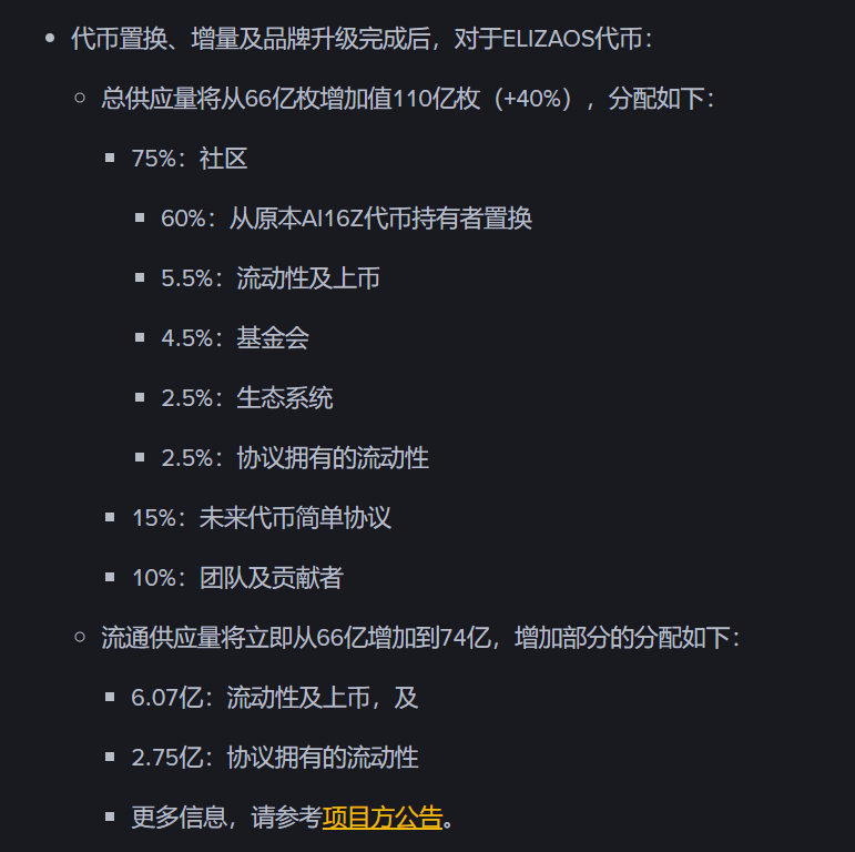 所有在Binance Alpha 2.0账户中的AI16Z代币将按照1个AI16Z = 6 个ELIZAOS的比例置换为ELIZAOS代币。