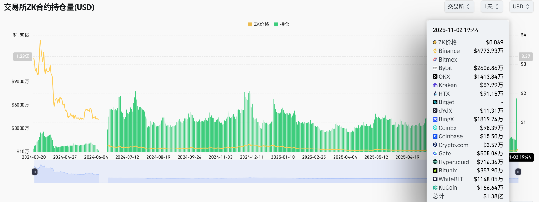 深潮 TechFlow 消息,11 月 2 日,据Coinglass最新数据显示,全网ZK合约总持仓达到20.16亿枚,持仓市值突破1亿美元,目前达到1.38亿美元,创历史新高,过去24小时增幅453.92%;其中币安ZK合约持仓量触及6.96亿枚,持仓市值为4773.93万美元;Bybit的ZK合约持仓量触及3.80亿枚,持仓市值为2606.86万美元。