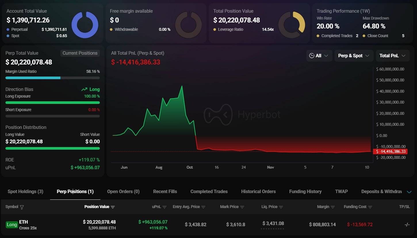 深潮 TechFlow 消息,11 月 10 日,据链上分析师 Onchain Lens(@OnchainLens)监测,在以太坊价格上涨期间,“麻吉大哥”黄立成持续扩大其 25 倍杠杆的以太坊多头仓位。