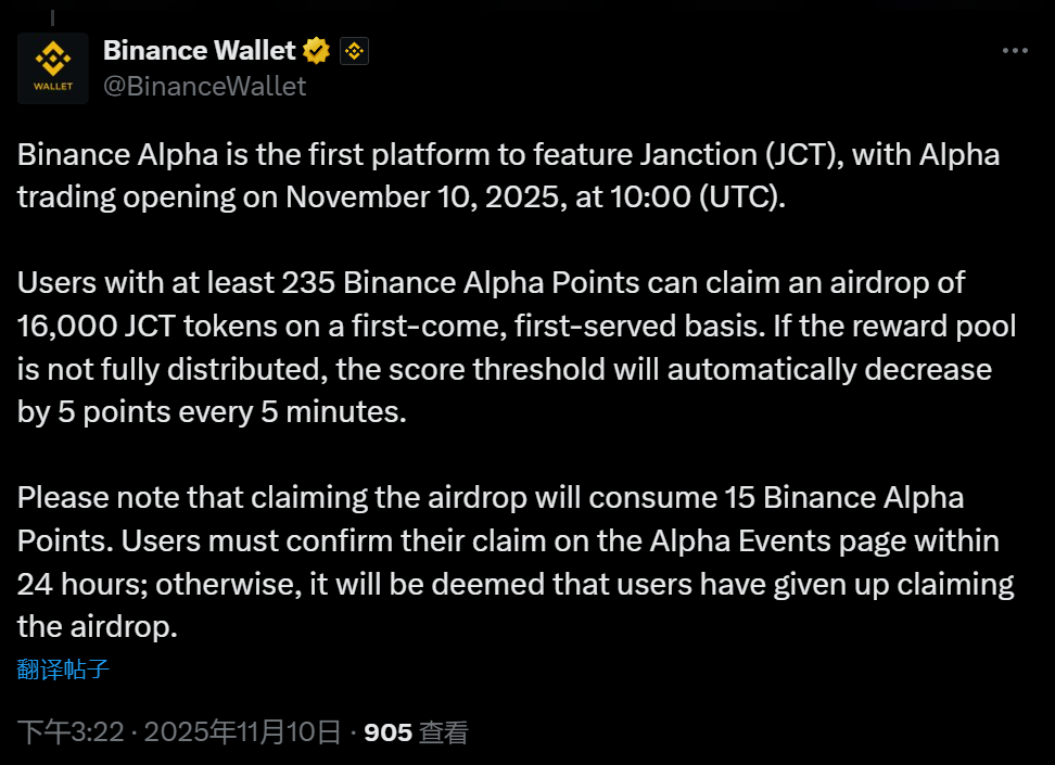 币安 Alpha: Janction (JCT) 空投申领门槛为 235 Alpha 积分