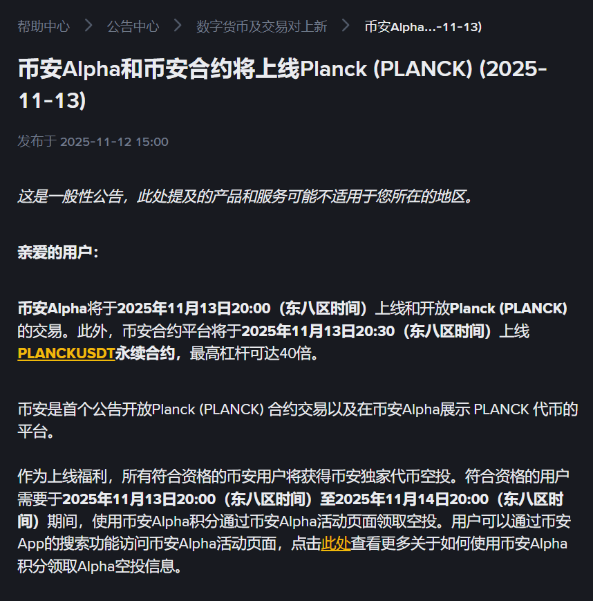 币安是首个公告开放Planck (PLANCK) 合约交易以及在币安Alpha展示 PLANCK 代币的平台。 作为上线福利,所有符合资格的币安用户将获得币安独家代币空投。符合资格的用户需要于2025年11月13日20:00(东八区时间)至2025年11月14日20:00(东八区时间)期间,使用币安Alpha积分通过币安Alpha活动页面领取空投。