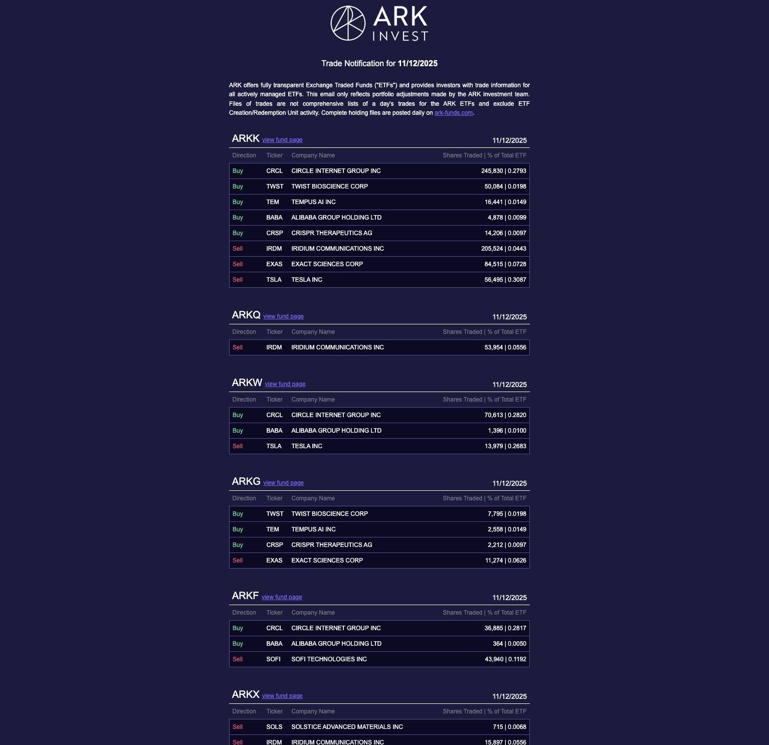 深潮 TechFlow 消息,11 月 12 日,据 Ark Invest Tracker 监测,Cathie Wood 旗下 Ark Invest 于昨日增持 353,328 股 Circle 股票(按当前价格计算,价值约 3049.22 美元)。