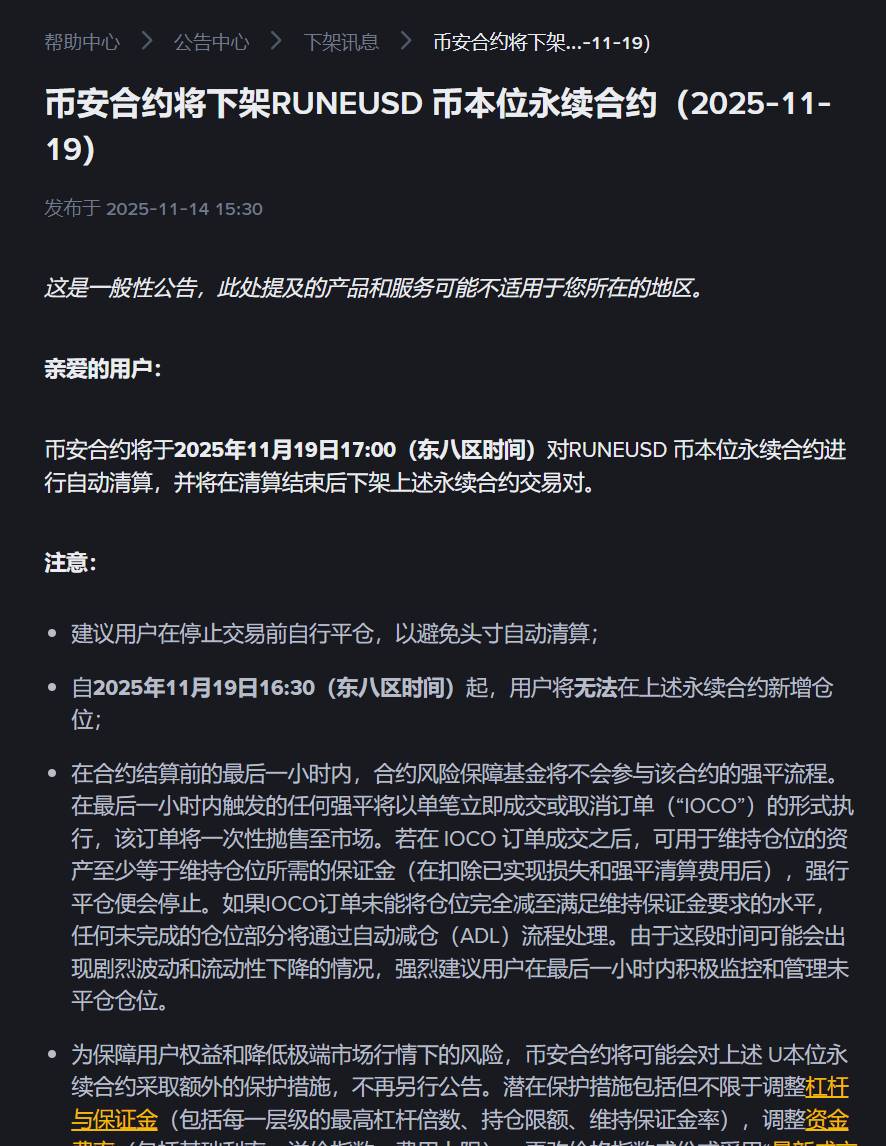 深潮 TechFlow 消息,11 月 14 日,据官方公告,币安合约将于2025年11月19日17:00(东八区时间)对RUNEUSD 币本位永续合约进行自动清算,并将在清算结束后下架上述永续合约交易对。