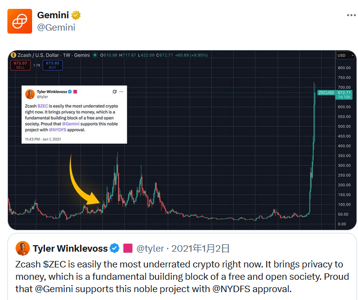 深潮 TechFlow 消息,11月16日,加密货币交易所Gemini在X平台转发其联创Tyler Winklevoss于四年多前2021年1月2日的推文,当时他表示Zash(ZEC)是最被低估的加密货币,因为隐私是自由开放社会的基础组成部分,Gemini已经获得纽约州金融监管机构批准上架。历史数据显示,ZEC当时价格仅约57美元,而目前已升至700美元区间,增长了11倍。