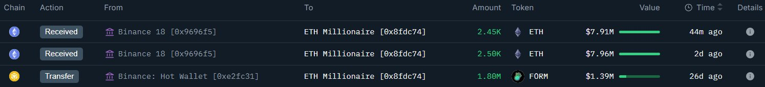 两天前,该巨鲸同样从币安提取 2560 枚 ETH,价值 796 万美元。