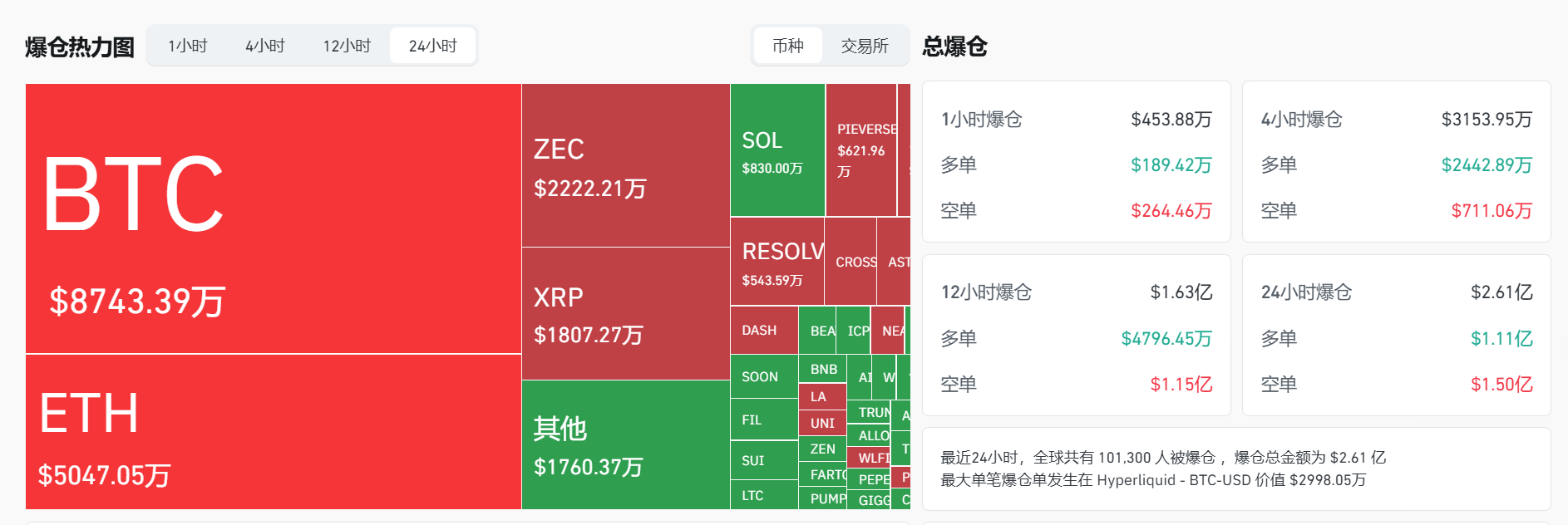 过去 24 小时全网爆仓 2.61 亿美元,多空双爆