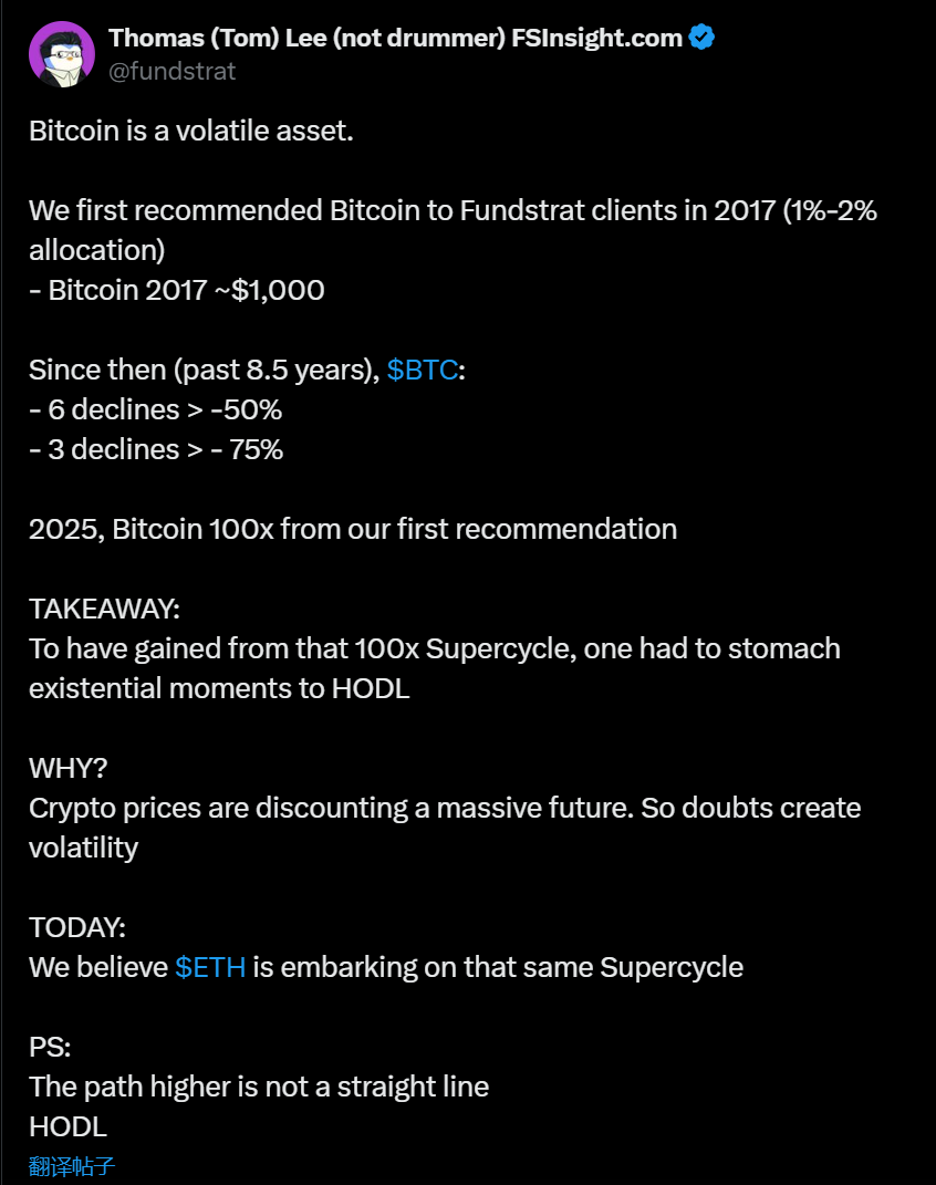 深潮 TechFlow 消息,11 月 16 日,BitMine 董事长 Tom Lee 在社交媒体发文表示,比特币是一种波动性资产。其公司于 2017 年首次向客户推荐比特币(配置比例为 1%-2%),当时 BTC 价格约为 1000 美元。