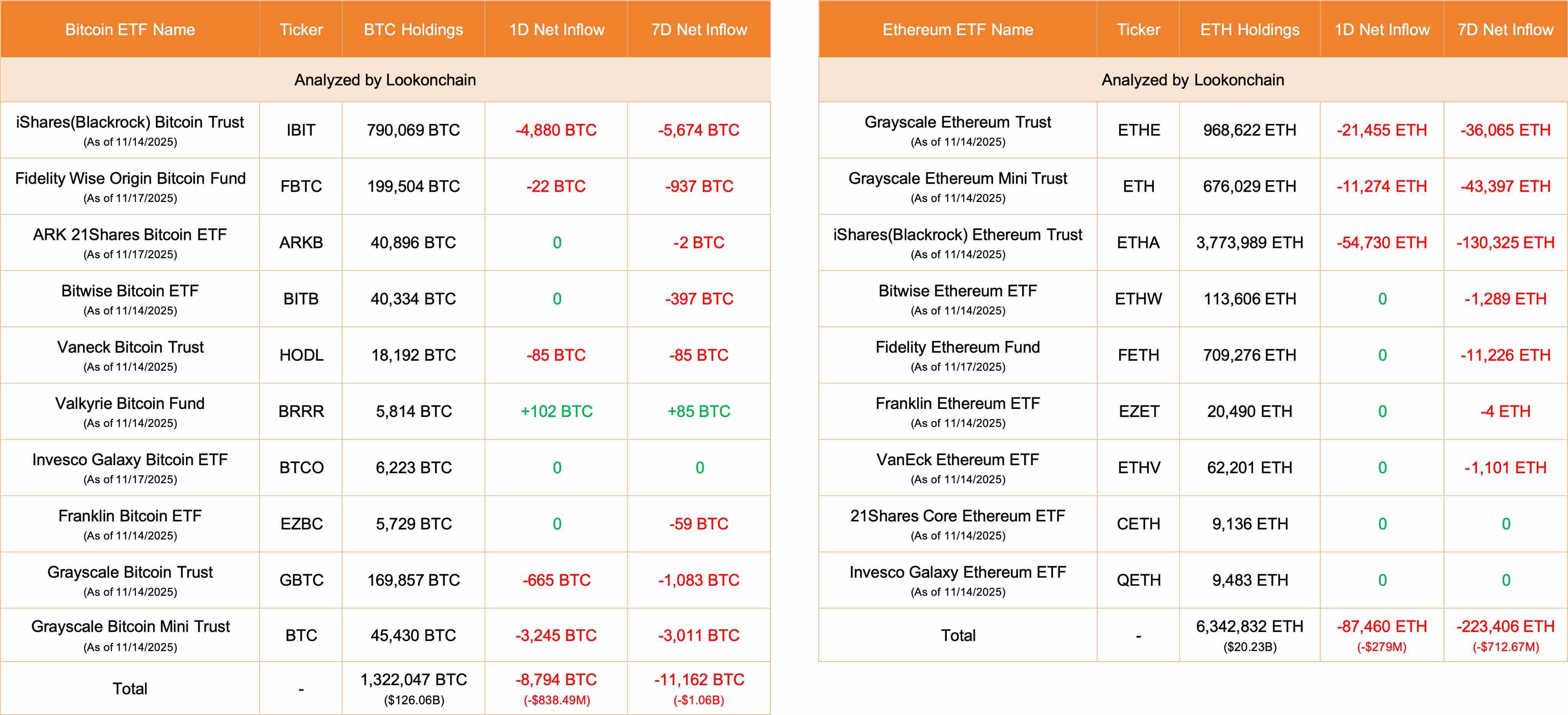 深潮 TechFlow 消息,11 月 17 日,据 Lookonchain 监测,截止于发稿,今日 10 只比特币 ETF 净流出 8,794 枚 BTC(价值 8.3849 亿美元),9 只以太坊 ETF 净流出 87,460 枚 ETH(价值 2.79 亿美元)。