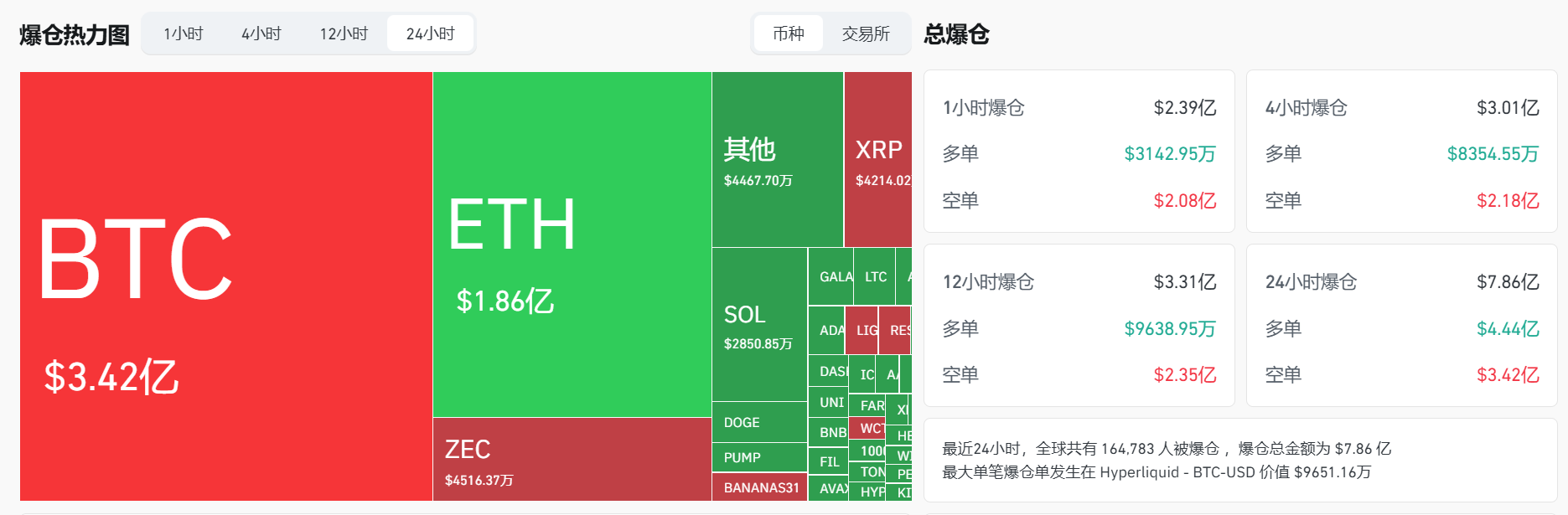 BTC 爆仓金额达 3.42 亿美元,ETH 爆仓 1.86 亿美元。过去 24 小时内共有 164,783 人被爆仓,最大单笔爆仓出现在 Hyperliquid 的 BTC-USD 交易对上,价值 9651.16 万美元。