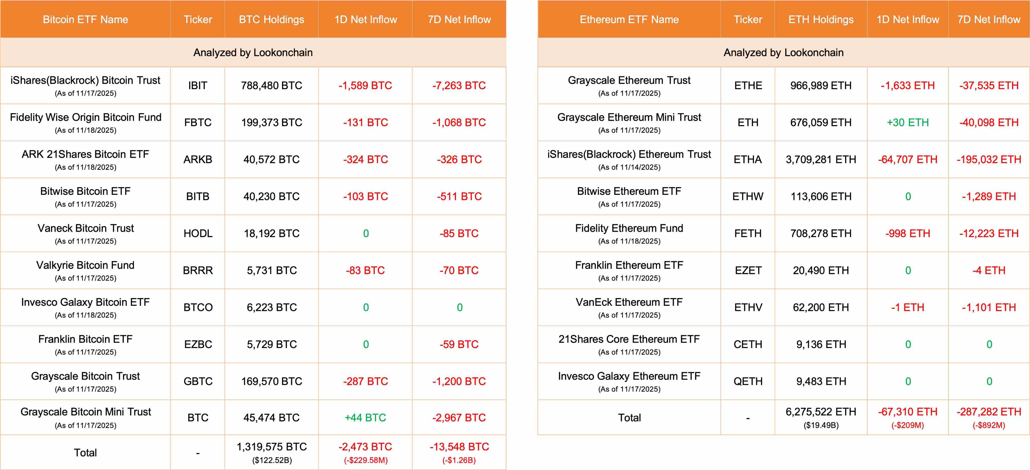 深潮 TechFlow 消息,11 月 19 日,据 Lookonchain 监测,截止于发稿,今日 10 只比特币 ETF 净流出 2,473 枚 BTC(价值 2.2958 亿美元),9 只以太坊 ETF 净流出 67,310 枚 ETH(价值 2.79 亿美元)。