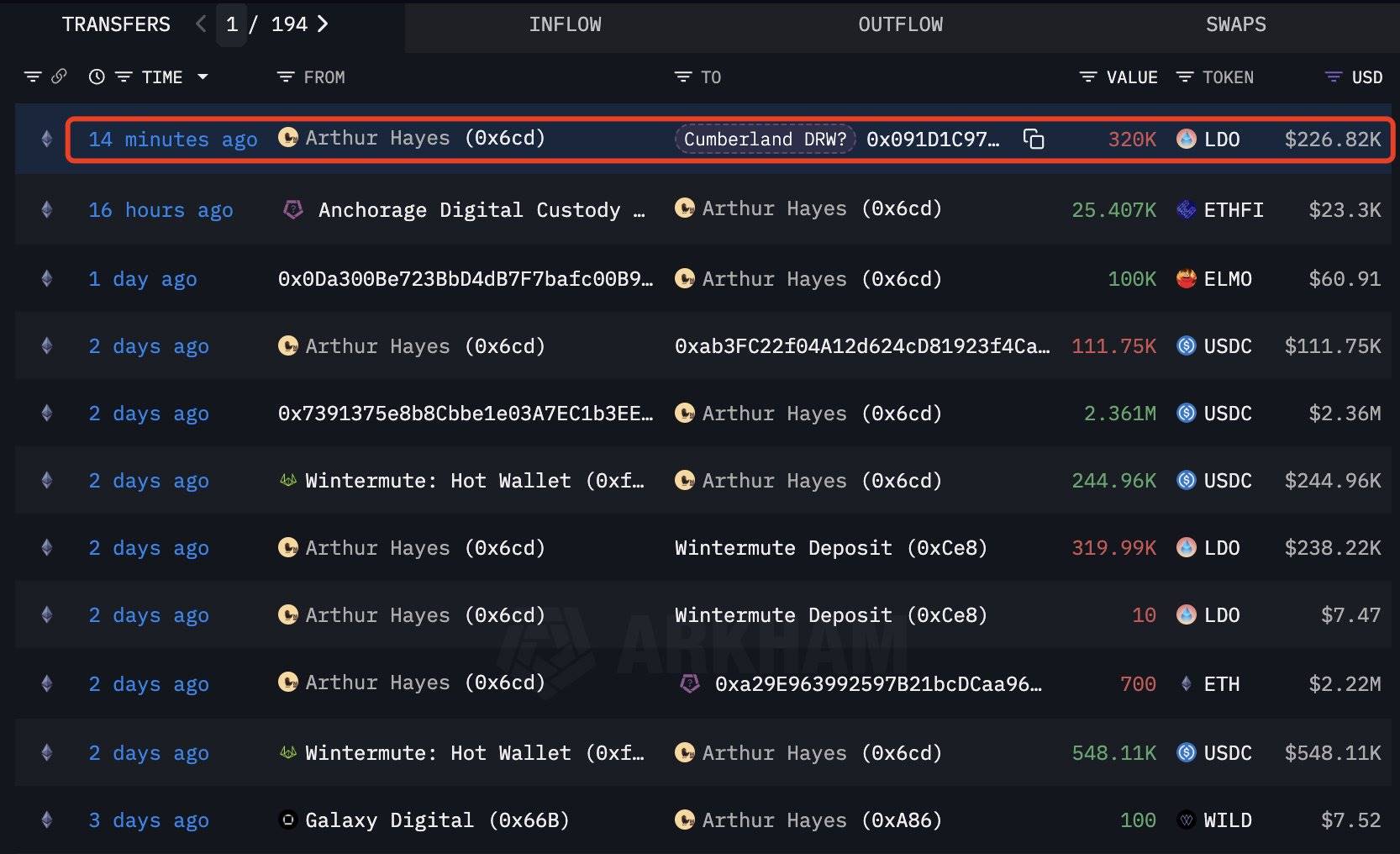 Arthur Hayes 再次卖出 32 万枚 LDO,价值 22.7 万美元