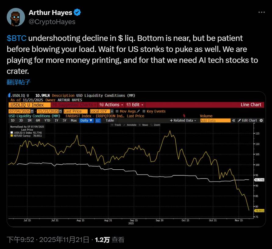 深潮 TechFlow 消息,11 月 21 日,BitMEX 联合创始人 Arthur Hayes 在社交媒体发文表示,“BTC流动性不足导致跌幅过大。底部即将到来,但不要急于“梭哈”。等待美国股市也出现暴跌。我们预期政府会进一步印钞,而这需要人工智能科技股暴跌。”